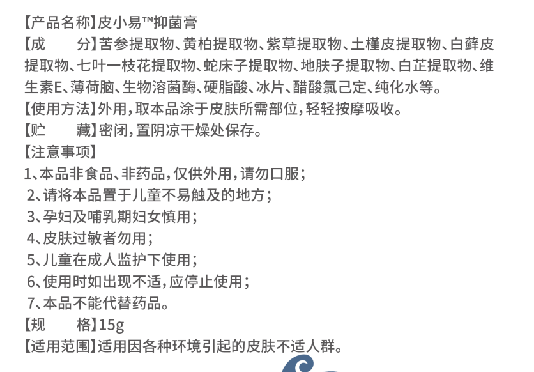 【產(chǎn)品名稱】:皮小易抑菌膏