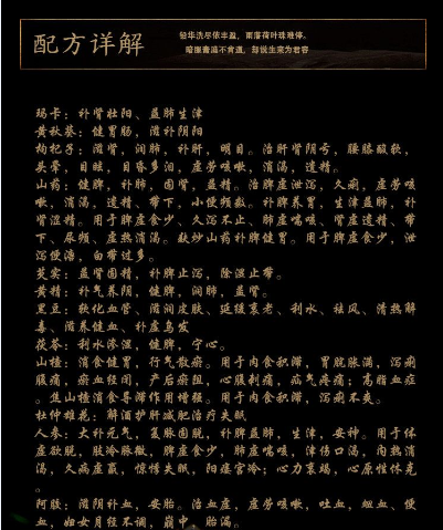 蜂蜜、黃秋葵、枸杞子、山藥、芡實、黃精、黑豆、茯苓、山楂、瑪咖粉、杜仲雄花、人參(人工種植)、阿膠、純化水。