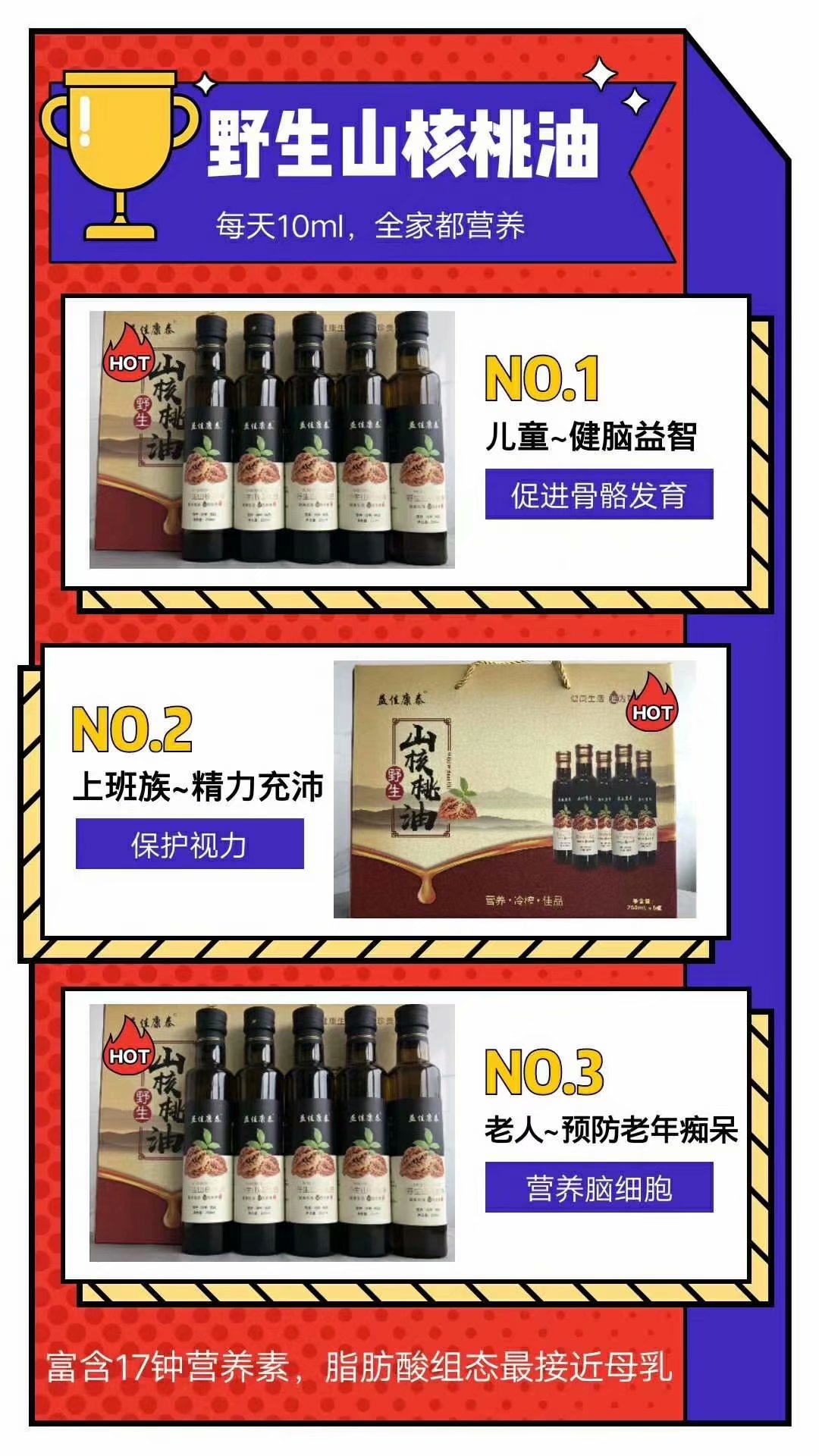 - 咱這一款是針對野生山核桃油半天落地會模式。1980的單,一套的話是20瓶。四個大禮盒,再送價值900的果蔬凈化機野生山核桃油營養(yǎng)價值高,易吸收,產(chǎn)品有高度,免教育產(chǎn)品,一說都認可1.不但老年人認同,2